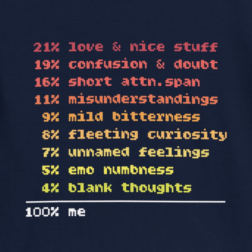 WORDS :: 21% love & nice stuff 19% confusion & doubt 16% short attn.span 11% misunderstandings 9% mild bitterness 8% fleeting curiosity 7% unnamed feelings 5% emo numbness 4% blank thoughts 100% me